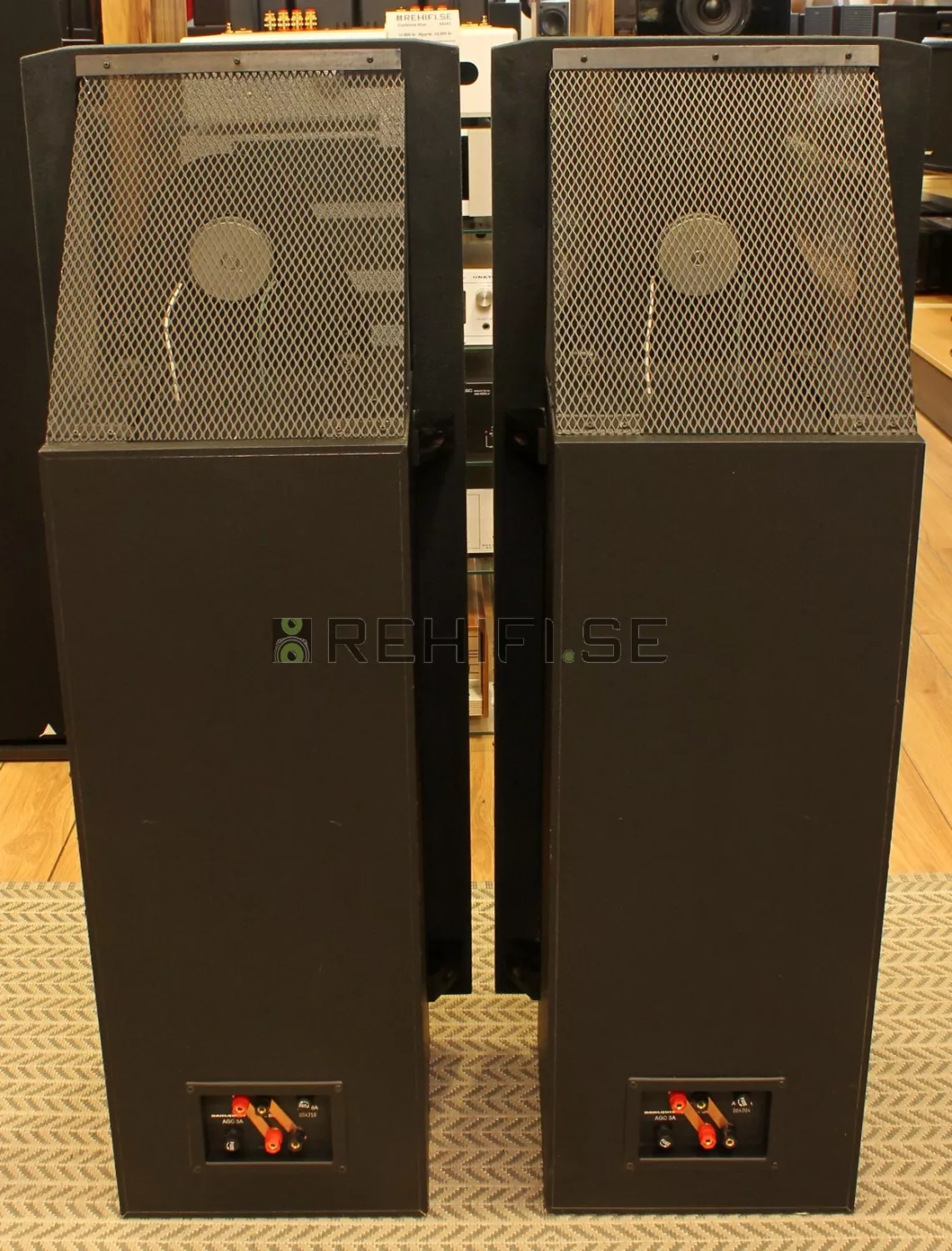 Information: Begagnade golvhögtalare i gott skick med lite bruksspår på baksidorna samt nopprigt tyg.