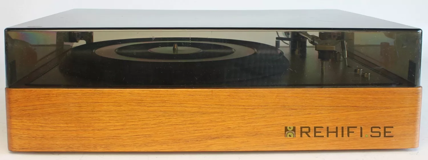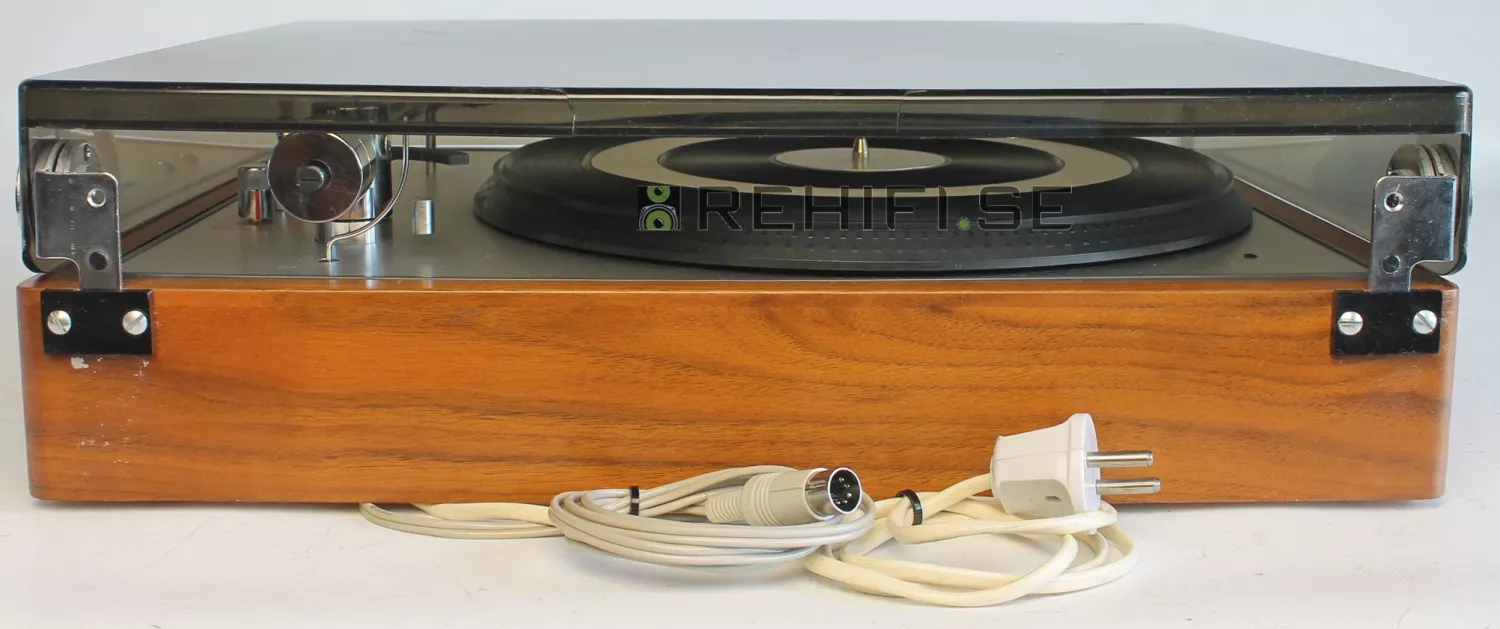 Information: Begagnad schweizisk remdriven skivspelare med autostop och fjädrande upphängning.