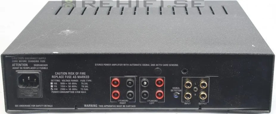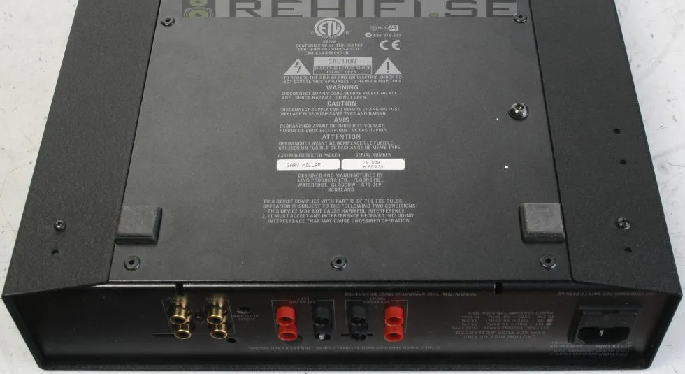 Slutsteg. Nypris 8.500 kr Ett kompakt slutsteg ifrån skotska Linn som framförallt är kända för sin skivspelartillverkning. Driver även svåra högtalarlaster utan problem. Automatiskt till och från slag gör att slutsteget går över i standby när ingen signal skickas till slutsteget. Specifikationer Uteffekt: 2x62 Watt RMS i 8 Ohm 2x85 Watt RMS i 4 Ohm Ingångskänslighet: 685 mV Gain: 28,6 dB Ingångsimpedans: 10 kOhm Frekvensomfång: 10-70 000 Hz -3dB Mått: 320x325x80 mm Vikt: 7 kg I gott skick. En del ytliga skador på chassit (färgflagor som lossnat), se bilder. OBS! inga bucklor