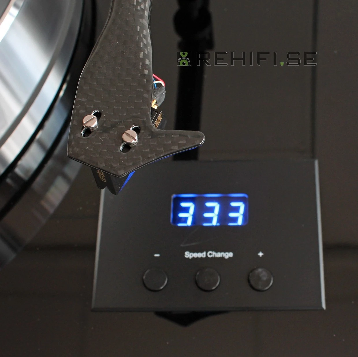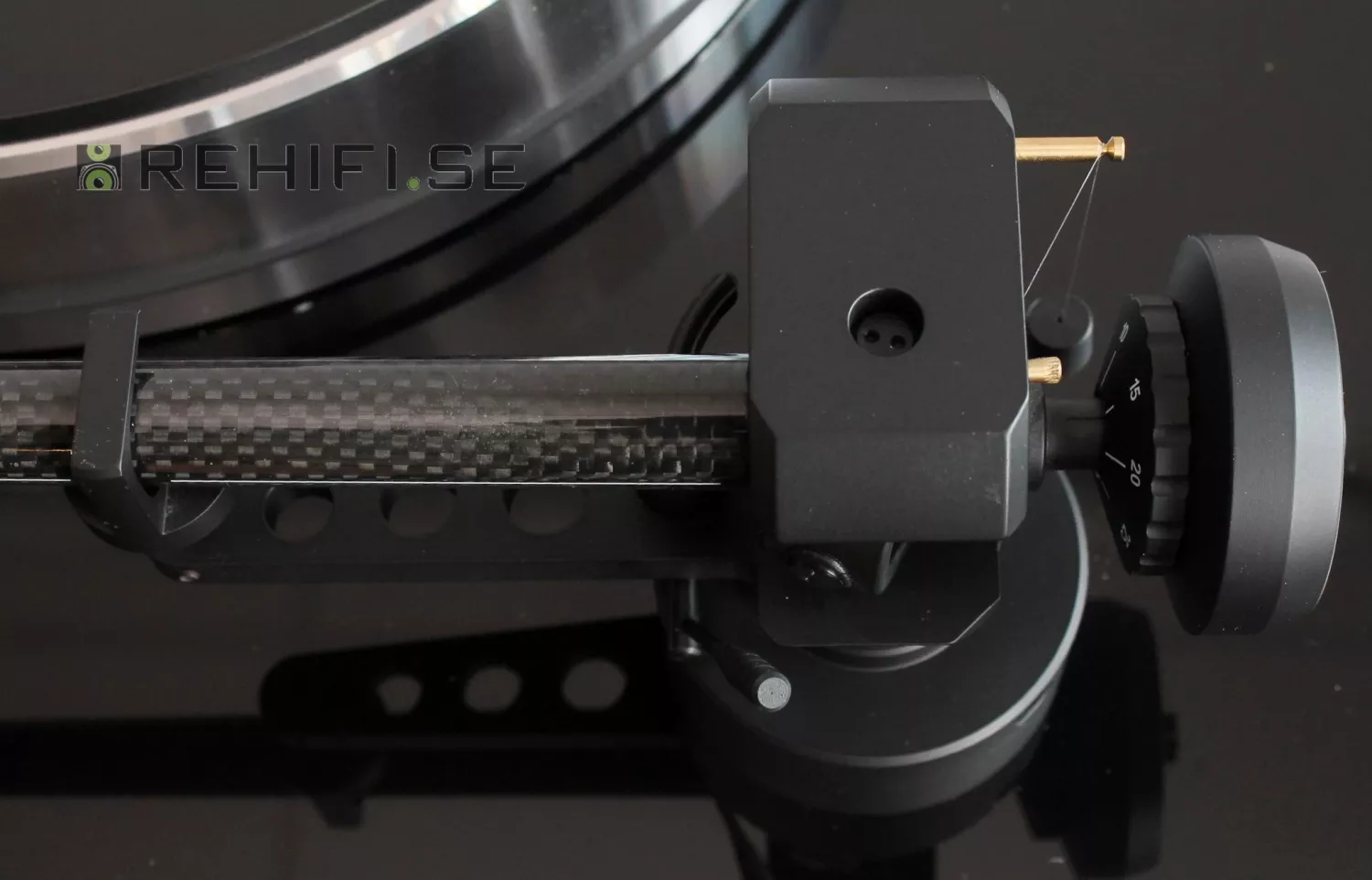 10 tums tonarm i kolfiber med 4 olika motvikter till olika pickupvikter inom spannet 4-14 gram.